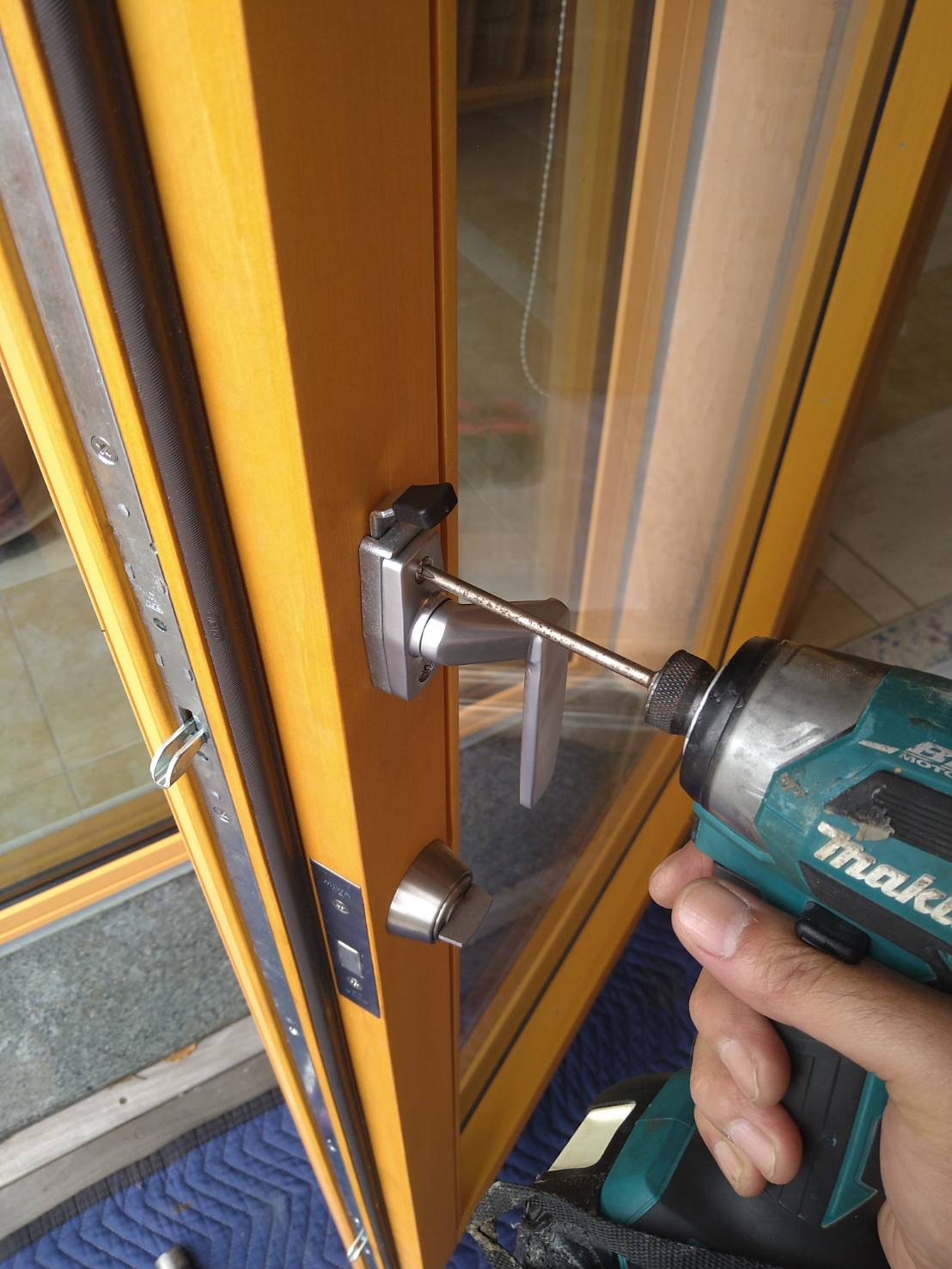 そのため 丁番の調整・固定強化 を行ったうえで、ロックがスムーズに噛み合うよう 受け金物の位置を微調整。また、ロック金物に不良が見られたため合わせて新しい物に交換しました。併せて、ハンドル内部の固定ボルトを見直し、ガタつきをしっかり解消しました。