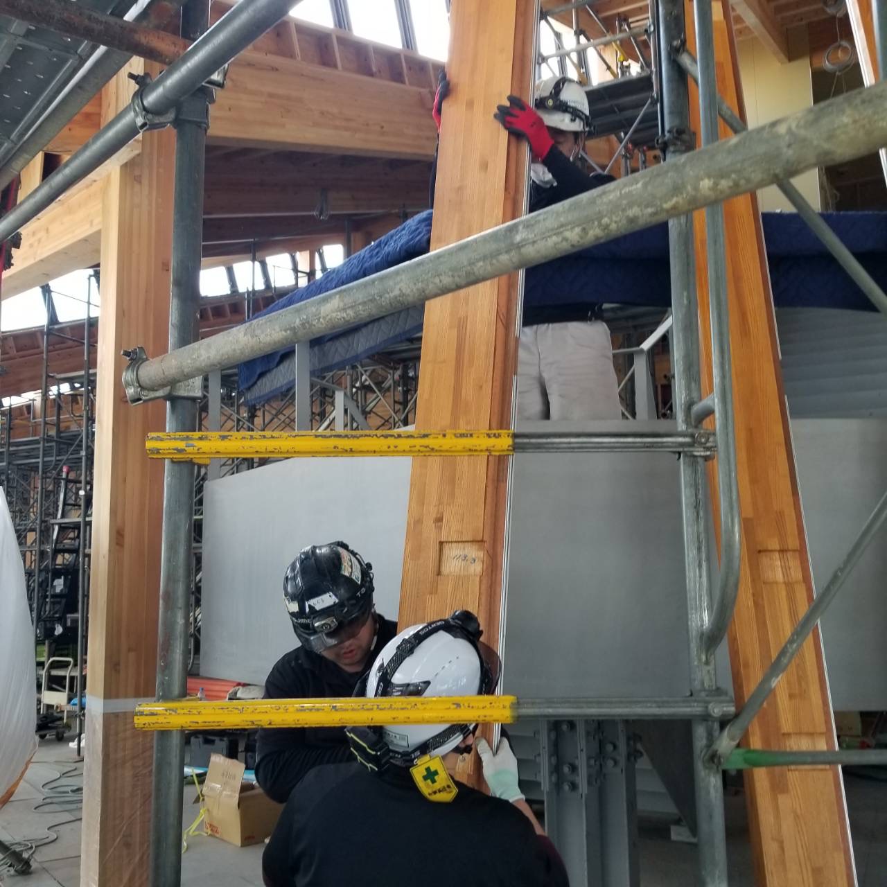 木製カーテンウォールは、一般的なアルミ製よりも加工精度・納まり調整が難しく、高い施工技術が求められます。今回は、大型サイズのため現場での精密な建て込みと躯体との取り合い処理が重要となりました。