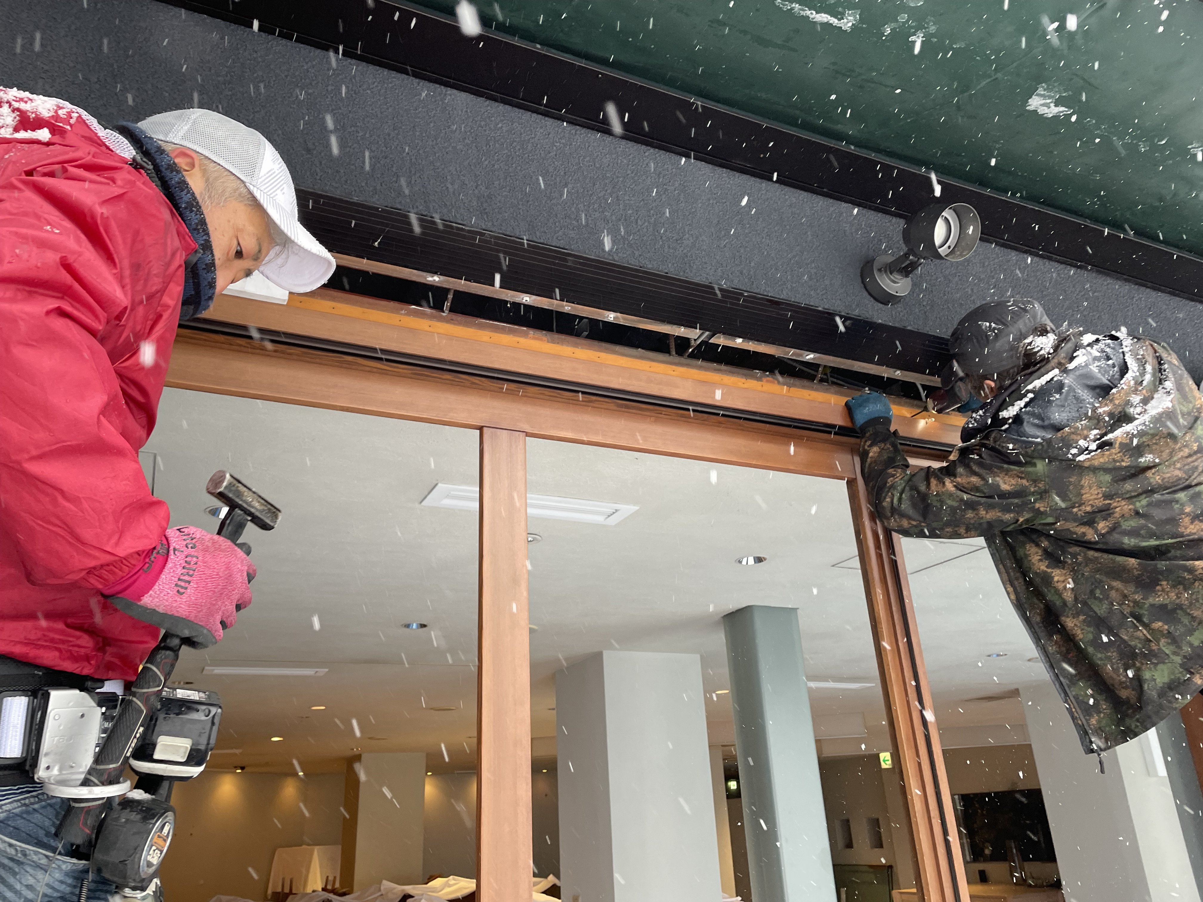 既存の木製折戸撤去および、カバー工法によるヘーベシーベ引戸への入替工事